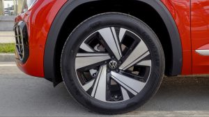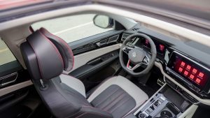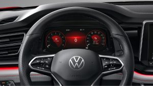 Vô lăng thể thao R-line 3 chấu bọc da, viền trang trí màu đỏ, tích hợp các phím điều khiển đa chức năng thuận tiện.